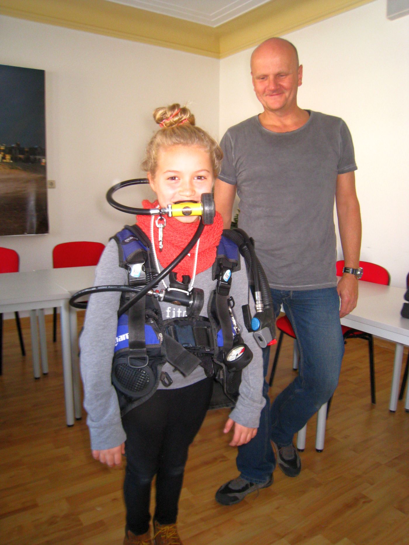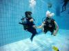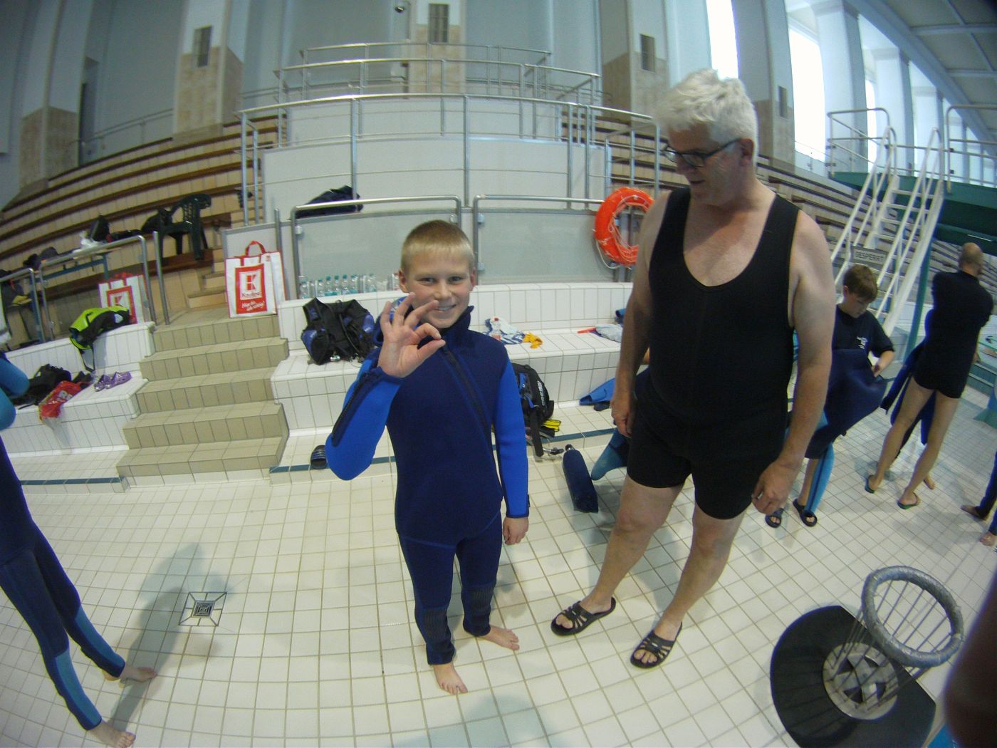 Nach einer kleinen Stärkung im Anschluss und der folgenden Einweisung in die Bestandteile einer Gerätetauchausrüstung, verbunden mit ersten praktischen Erfahrungen beim Zusammenbau und dem Umgang mit der Ausrüstung ging es gemeinsam mit den Ausbildern Torsten, Raik und Hagen am 4,80m tiefen Sprungbecken weiter. Viel Gelächter und Hallo dann beim Anziehen der Tauchanzüge. stellte es sich doch oft als schwieriger heraus als erwartet und auch die Erfahrung des Auftriebs nach dem Sprung ins Wasser war doch für viele Kinder etwas völlig Neues. Hier bekamen wir tatkräftige Unterstützung durch Sven, Gerätewart im Verein. Er half überall beim anlegen und anpassen der Ausrüstung und so konnte noch am Nachmittag jedes Kind eine kleine Runde mit einem Ausbildern im Sprungbecken drehen.