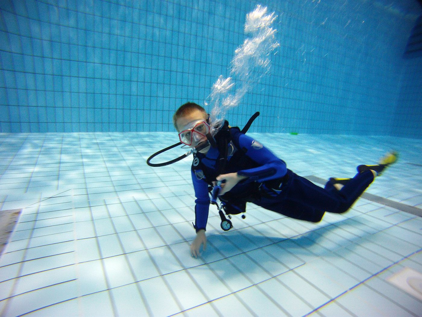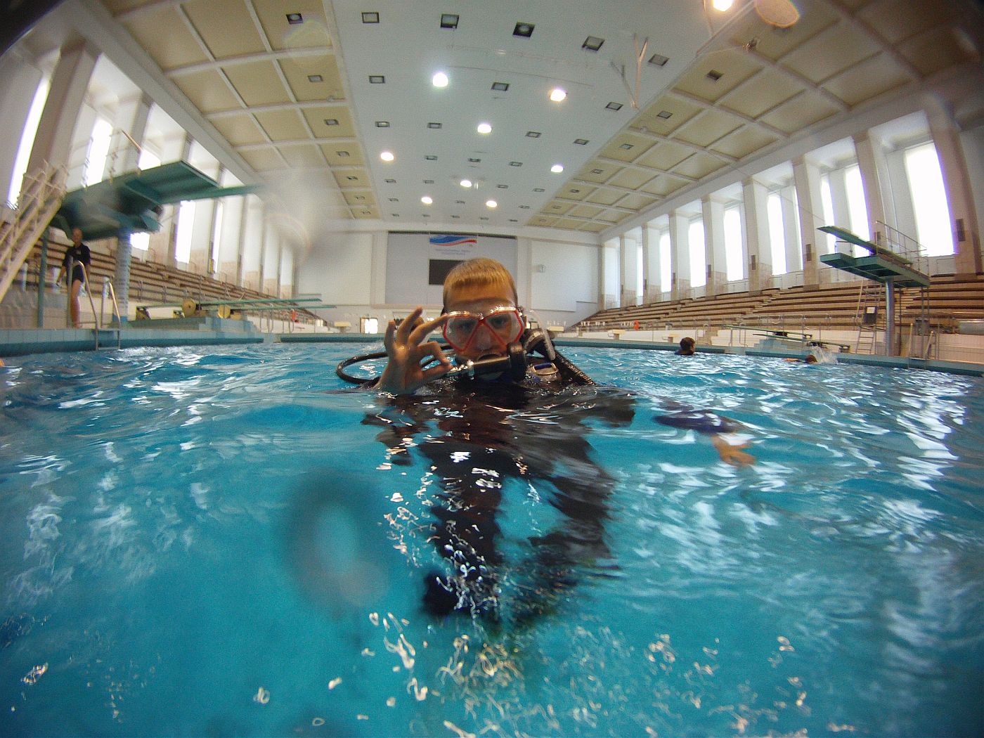 Als sich alle am nächsten Morgen wieder im Schulungsraum trafen war der lange Vortag in mach einem Gesicht zu erkennen aber auch die Vorfreude auf den zweiten Tag des Tauch-Wochenendes. In dem kurzen Theorieteil konnten die Kinder zum Teil schon ihre am Vortag gemachten Erfahrungen einfließen lassen und die Spannung auf den folgenden ausgedehnten Tauchgang im Sprungbecken wuchs.