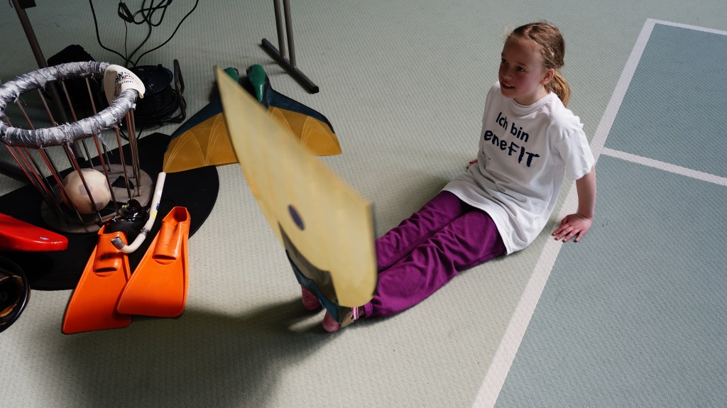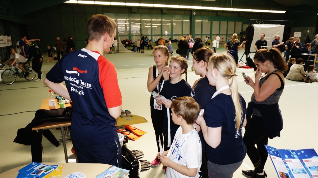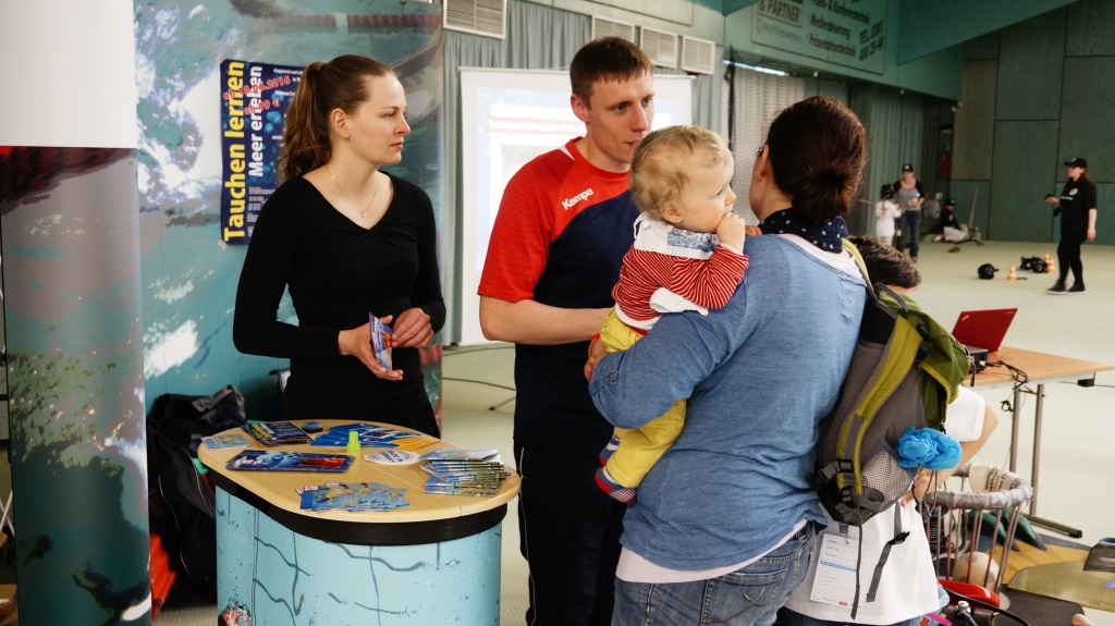 Das Ausprobieren von Ausrüstungsgegenständen wie Monoflossen oder Atemregler stand bei den Mädchen und Jungen zwischen vier und zwölf Jahren hoch im Kurs. Obwohl sich der Reiz unserer Wassersportarten in einer Turnhalle natürlich nur eingeschränkt demonstrieren lässt, haben wir doch mit Hilfe einer Foto- und Videopräsentation sowie in unzähligen Gesprächen zumindest ansatzweise die Faszination von Flossenschwimmen, Orientierungstauchen, Sporttauchen und Unterwasserrugby vermitteln können.