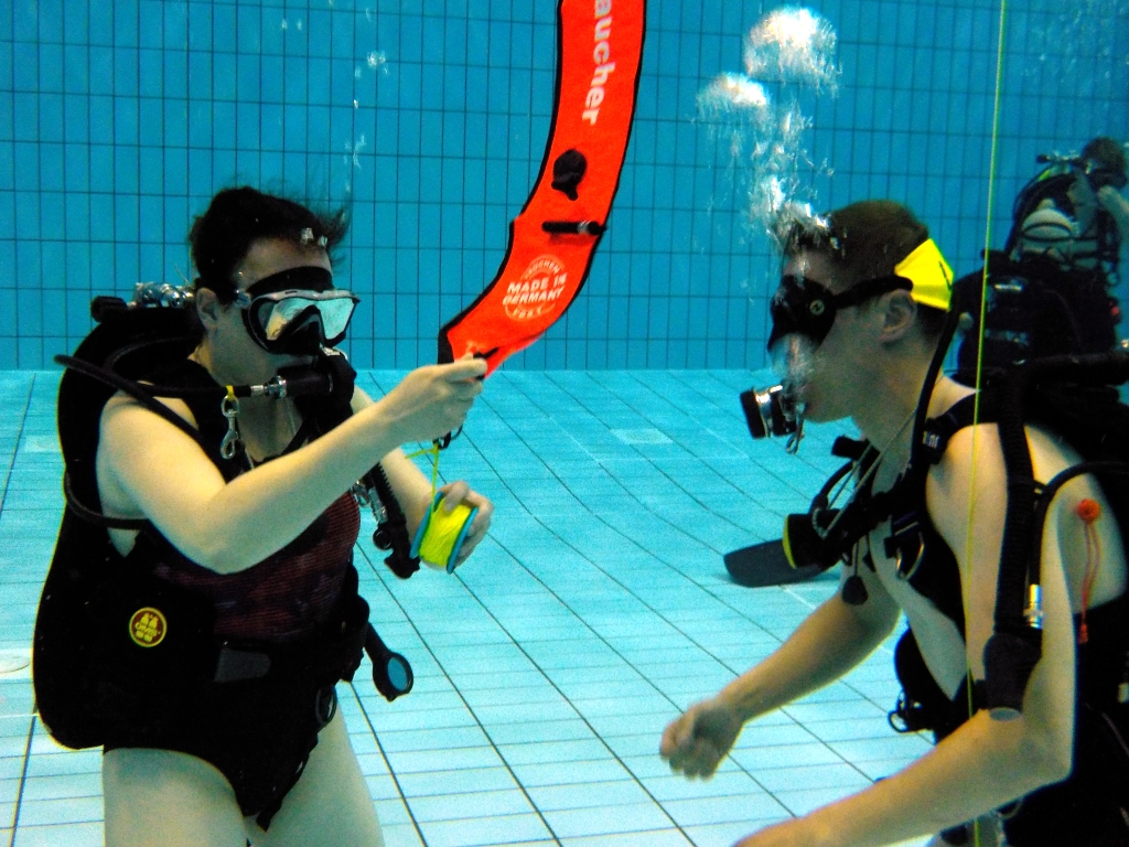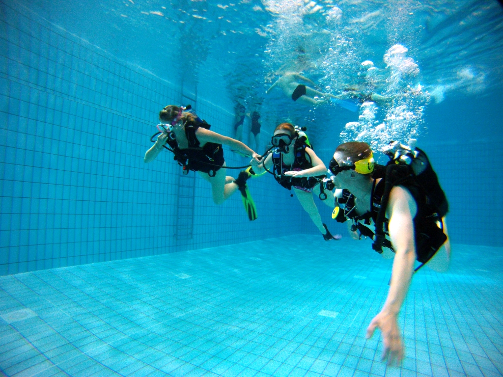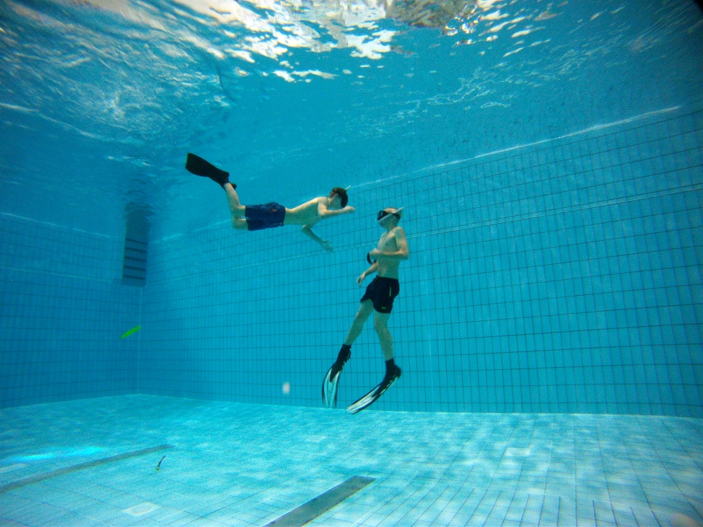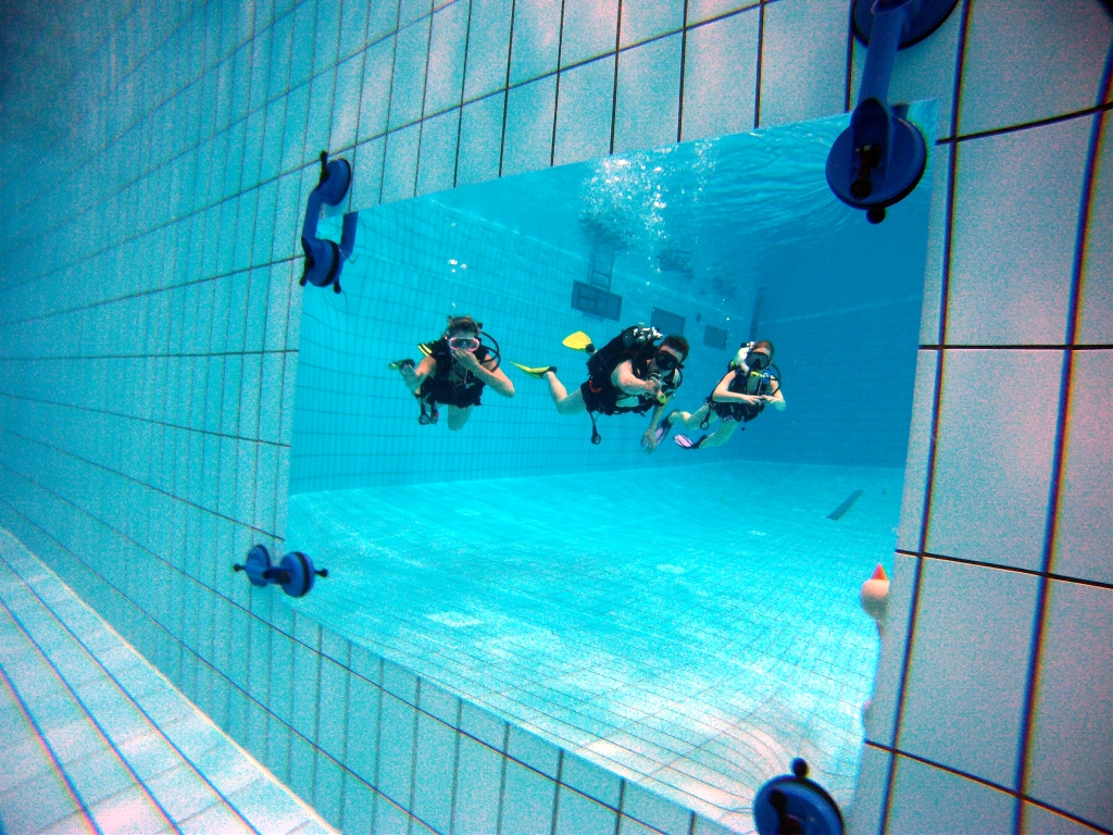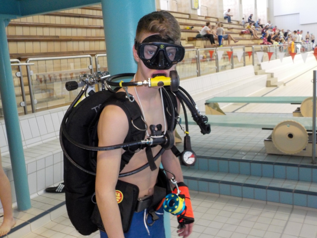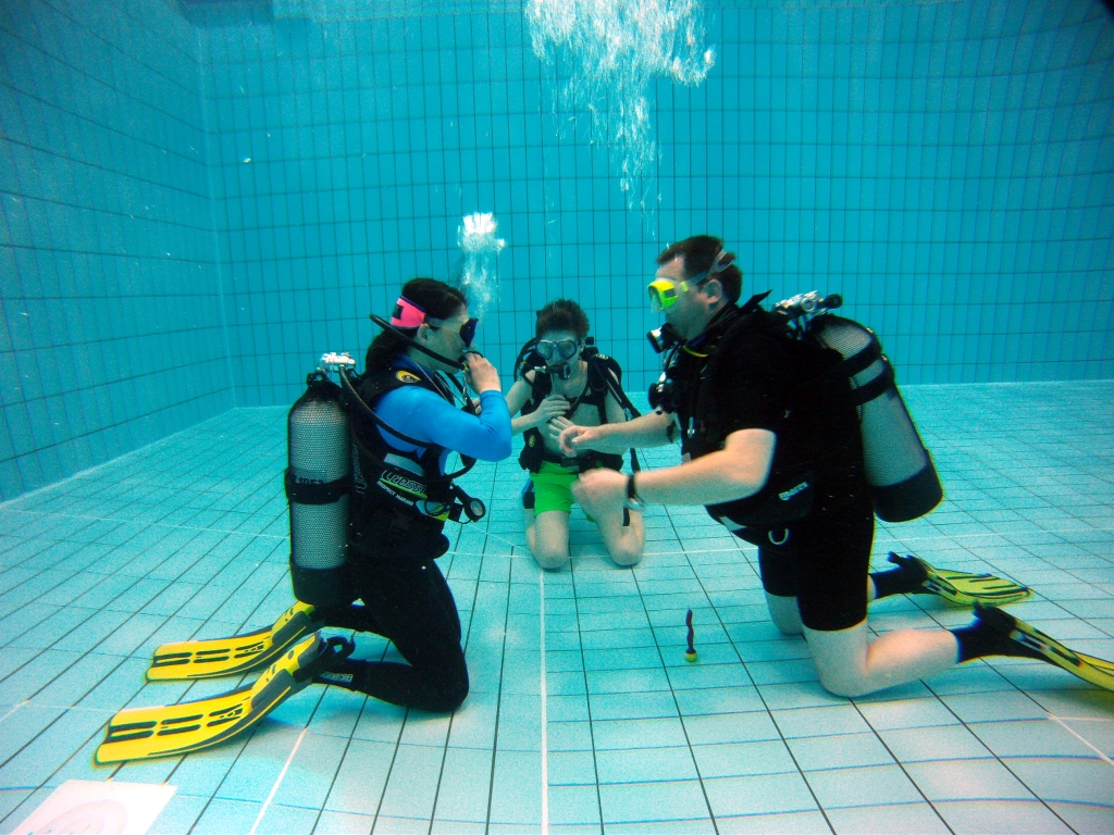 Nun gestalltete sich an zwei Wochenende im April ein spannendes Programm aus Theorie und Praxis. Die zu besprechenden Themen waren vielfältig und aus den unterschiedlichsten Bereichen: Tauchphysik, Tauchmedizin, Tauchtechnik, Organisation und Sicherheitsbestimmungen. Zum Glück gab es immer wieder auch ausreichend Zeit Gelerntes gleich in die Praxis umzusetzen und erste Erfahrungen unter idealen Bedingungen im 4,80 Meter tiefen Sprungbecken unter Aufsicht erfahrener Ausbilder zu sammeln. Neben den ersten Übungen mit dem Tauchgerät kam das Konditionstraining und Überungen mit Flossen, Maske und Schnorchel dazu. So waren die Tage gut gefüllt und alle waren am Ende besten vorbereitet für den ersten Tauchgang im Freiwasser.