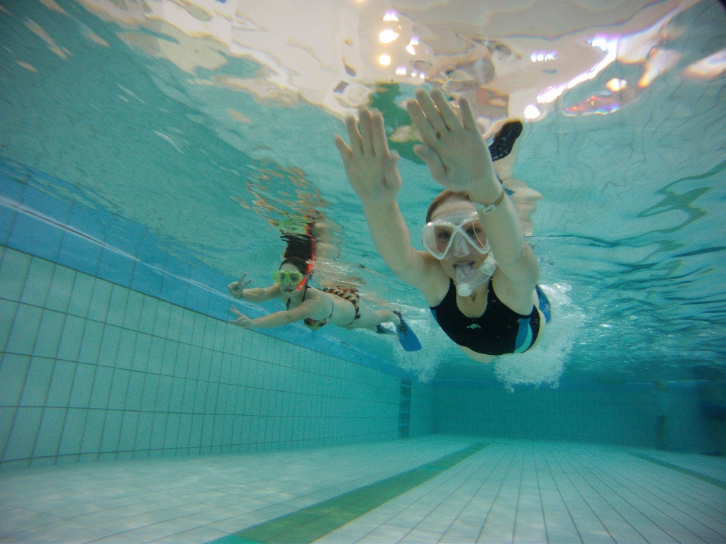 Der Druckausgleich, der den Druck im Mittelohr an den Umgebungsdruck angleicht, verhindert starke Schmerzen im Ohr, da der Druck beim Tauchen in die Tiefe auf das Trommelfell bzw. Mittelohr zunimmt. Gegen Mittag und nach einer Stärkung war es endlich soweit, wir konnten ins Wasser. Mit Tauchmaske, Schnorchel und Flossen ausgestattet, gingen wir in die Schwimmhalle und absolvierten unter Aufsicht unsere ersten Tauchmeter. Streckentauchen, "Ringe holen", Zeittauchen und Abschleppen füllten den ersten Teil des Nachmittages.