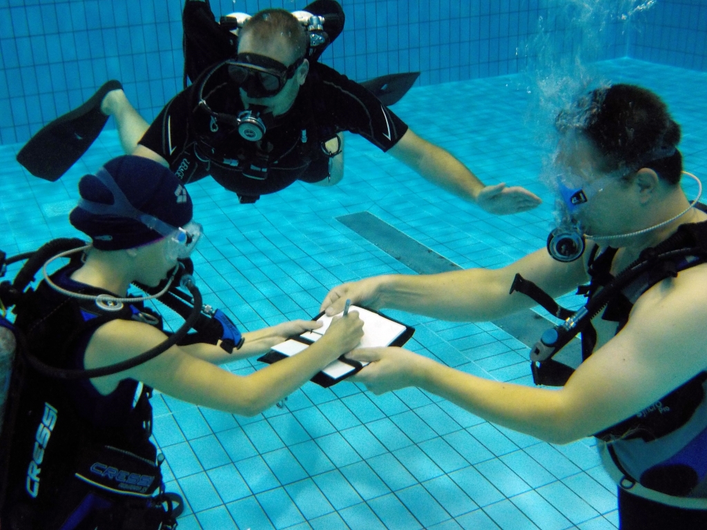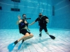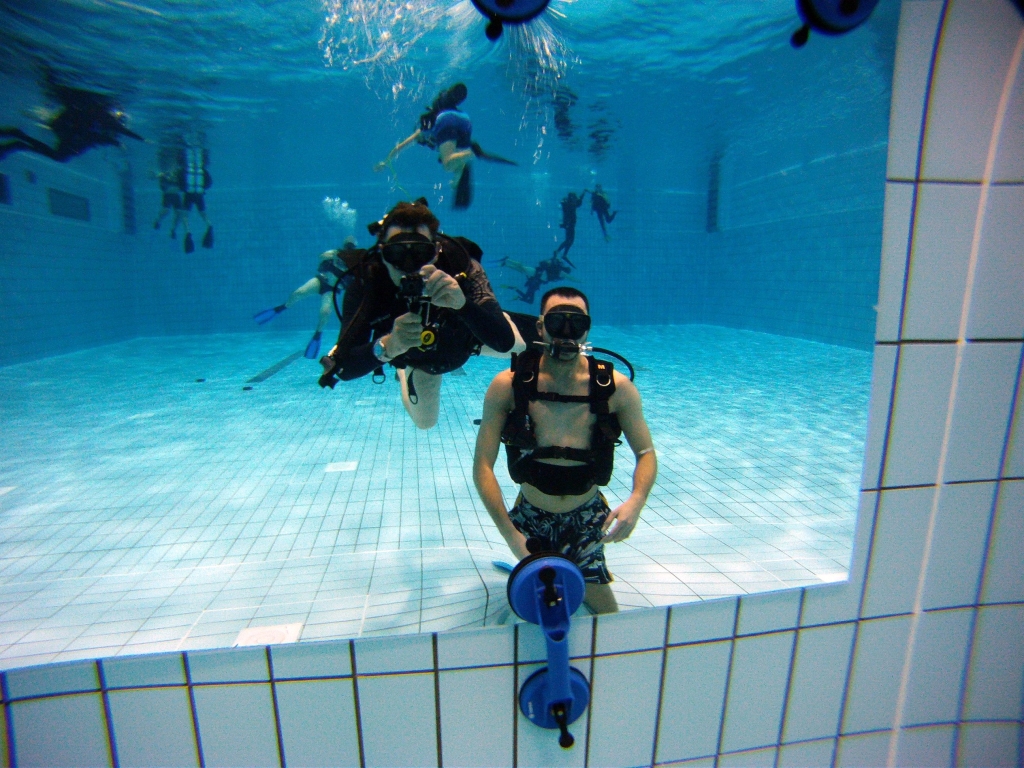 Der Sonntag startete ebenfalls um zehn Uhr mit einer weiteren Theoriestunde im VIP-Raum. Nach einer Wiederholung der Themen des Vortages und dem neuen Thema "Grundlagen der Tauchphysik" stärkten wir uns mit Gulasch und Nudeln (sehr lecker!) für den langen Tauchgang im fast fünf Meter tiefen Tauchbecken. Nach der Mittagspause baute jede Gruppe die Tauchausrüstung selbstständig zusammen. Selbstverständlich standen die Ausbilder mit geschultem Blick immer beiseite. Und nun endlich, wir konnten tauchen gehen. Mit unseren Tauchlehrern tauchten wir entspannt ins Sprungbecken ab. Diesmal für eine längere Zeit, für fast 45 Minuten. Wir bewegten uns nahezu schwerelos und dreidimensional im Wasser. Auf dem Boden des Sprungbeckens spielten wir z. B. mit einem Unterwasserball, einem Spieltorpedo oder entspannten bei einer Runde Unterwasser-Tick-Tack-Toe.