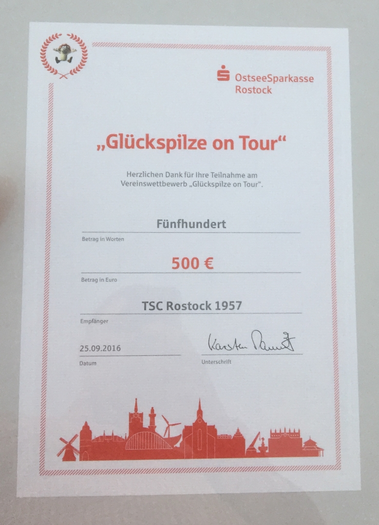 Auch wenn wir nicht den Bus gewonnen haben, so gab es doch Grund zur Freude. Denn auf dem gesonderten Empfang vor dem Spiel der Seawolves, zu dem jeweils 2 Vereinsvertreter eingeladen waren, gab es gleich mehrere Überraschungen! Als erstes verkündeten die Vertreter der OSPA, Herr Pannwitt und Herr Susa, dass die Kosten für die zusätzlich Karten auch von der OSPA übernommen werden. Die zweite Überraschung gestalteten die beiden Herren etwas spannender und dementsprechend gab es auch einen großen Jubel, als sie den Gästen mitteilten, dass alle Vereine für ihre Vereinskasse 500 € bekommen. Zum Abschluss des Empfangs gab es zudem noch einen Umschlag mit 20 Beratungsgutscheinen im Gesamtwert von 1000 €. Mit diesen Gutscheinen kann jedes Mitglied oder jeder Unterstützer des Vereins bis Ende November zu einem Beratungsgespräch bei der OSPA gehen und der jeweilige Verein bekommt dafür weitere 50 € für die Vereinskasse. Diese zusätzliche Aktion ist dabei unabhängig von einem Vertragsabschluss. Wer also Zeit und Lust hat sich über die Leistungen und Produkte der Ostsee Sparkasse Rostock beraten zu lassen, kann sich ab kommenden Dienstag (04.10.2016) einen solchen Gutschein im Büro des TSC Rostock abholen.