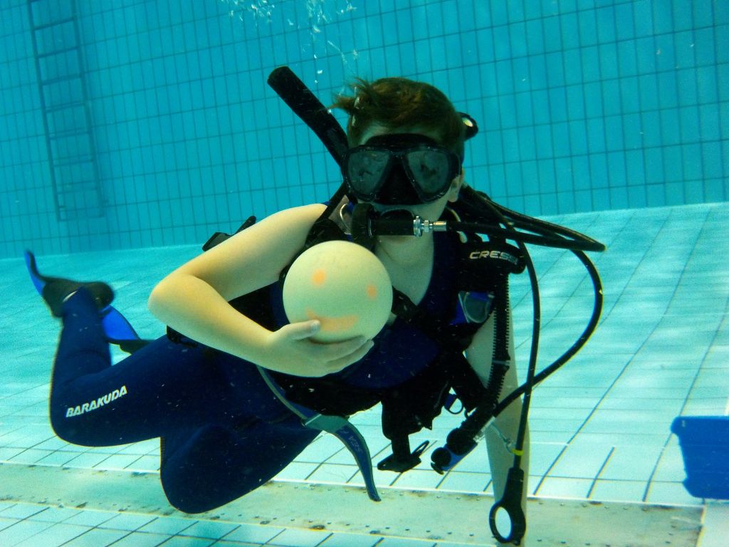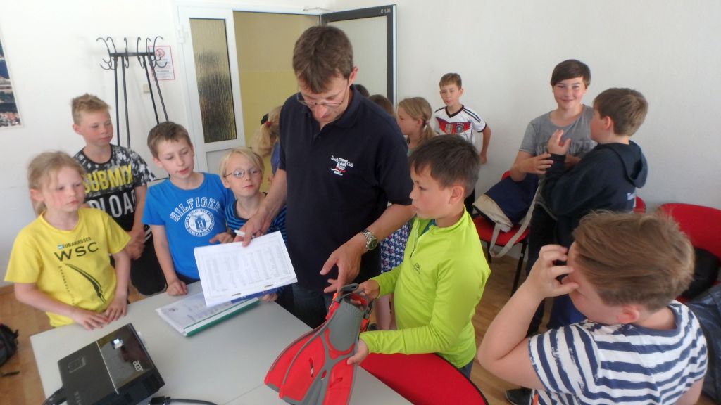 Nach einer kurzen Einweisung aller Kinder und ihrer Eltern am Samstag morgen und der anschließenden Klärung der Voraussetzungen und Formalitäten ging es mit dem ersten der notwendigen Theorieblöcke weiter. Anschließend konnte es endlich ins Wasser gehen. In der Schulschwimmhalle lernten die Kinder den Umgang mit der ABC-Ausrüstung - Flossen, Maske und Schnorchel und absolvierten die Aufgaben für die Schnorchelabzeichen "Otter" und "Robbe" sowie das KTSA. Mit den Aufgaben und etwas Zeit zum Spielen waren die zwei Stunden wie nix verflogen.