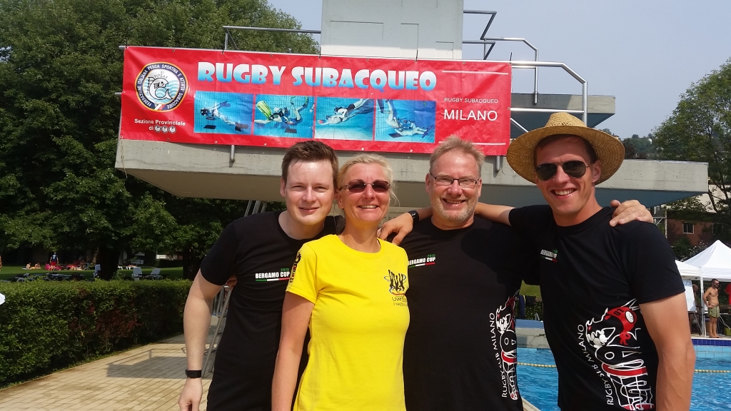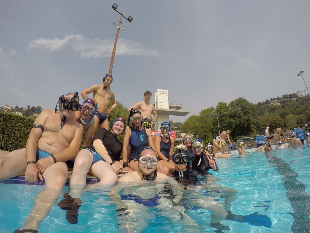 Nachdem am Freitagabend endlich alle eingetroffen waren und wir gemeinsam bei Pizza und Pasta einen „Schlachtplan“ geschmiedet hatten, starteten wir Samstag zum Turnier. Im schönen Freibad von Bergamo stellte der 70 cm hohe Beckenrand die erste Herausforderung dar, mit der wir aber ganz gut klar kamen.Die Auslosung bescherte uns in der ersten Runde eine ziemlich starke Gruppe, was sich im Verlaufe des Turniers aufgrund des angewendeten Modus beim Kampf um die Plätze als kleiner Nachtteil erwies.