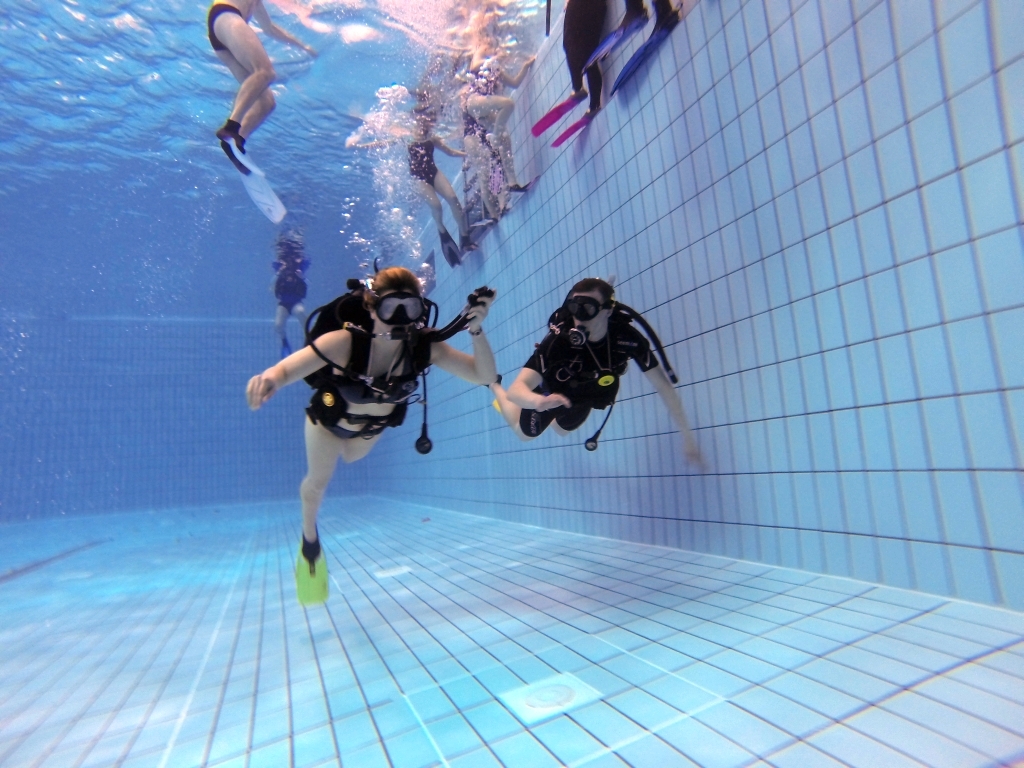 Nun gestalltete sich an zwei Wochenende im April ein spannendes Programm aus Theorie und Praxis. Die zu besprechenden Themen waren vielfältig und aus den unterschiedlichsten Bereichen: Tauchphysik, Tauchmedizin, Tauchtechnik, Organisation und Sicherheitsbestimmungen. Zum Glück gab es immer wieder auch ausreichend Zeit Gelerntes gleich in die Praxis umzusetzen und erste Erfahrungen unter idealen Bedingungen im 4,80 Meter tiefen Sprungbecken unter Aufsicht erfahrener Ausbilder zu sammeln. Neben den ersten Übungen mit dem Tauchgerät kam das Konditionstraining und Überungen mit Flossen, Maske und Schnorchel dazu. So waren die Tage gut gefüllt und alle waren am Ende besten vorbereitet für den ersten Tauchgang im Freiwasser.
